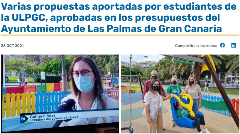 Noticia aparecida en la página web de la ULPGC el 28 de octubre de 2021 en la que se pueden consultar varias propuestas aportadas por estudiantes de la ULPGC, aprobadas en los presupuestos del Ayuntamiento de Las Palmas de Gran Canaria