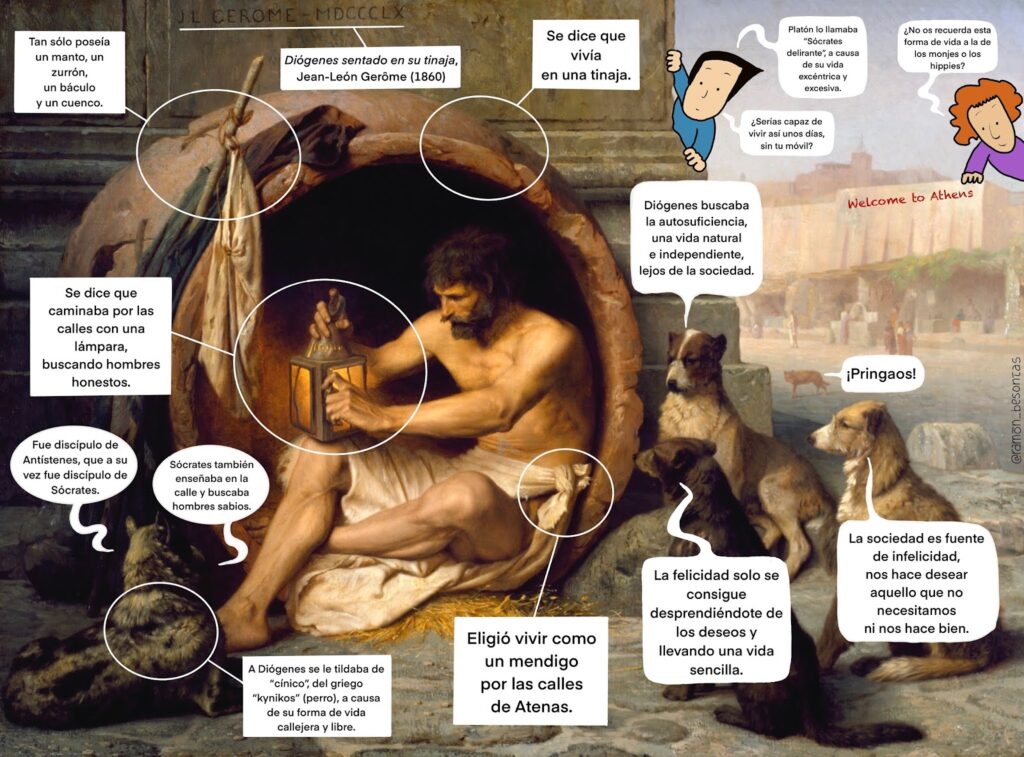Fue Diógenes Laertes, también llamado Diógenes de Sinope o Diógenes el Cínico, uno de los primeros en autoproclamarse cosmopolita, o sea, ciudadano del cosmos. Estaba en la filosofía cínica la idea de ser ciudadanos, pero no de la polis griega, sujeta a convenciones arbitrarias e injustas, sino del cosmos. Planteaban una vida en comunidad, en la ciudad, pero siguiendo otras reglas más simples que veían en la naturaleza. De hecho la imagen que acompaña a estos filósofos era la del perro callejero que no se somete al orden o la disciplina, como hacían otro tipo de perros. Así lo muestra este cuadro de Gerôme (1860) y lo explica la viñeta del blog Filosofía por un tubo (2019).